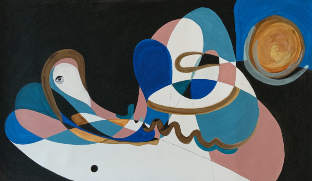 Adrianna worked on this painting over many months while living in wild northern Ireland. One of her earlier works, its intricacy clearly shows her heart and soul. Within a surreal landscape, two lovers can be seen, one of whom reclines on the right, presenting a pose of content and relaxation. Adrianna feels with this work she was unknowingly projecting a yearning for happiness and love which resulted in the chance encounter with her future husband.