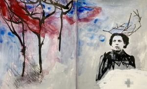Ich arbeite mit Gase und einer Masse auf Leinwand und Tiefdruckpapier.Außerdem Rohrfederzeichnung auf Leinwand.