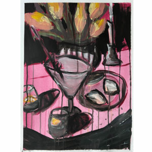 Die ausgebildete Tänzerin hält Menschen,(Stadt-)Landschaften,Stillleben in dynamisch-abstrahierten Strichzeichnungen fest,um sie dann durch kontrastierende (Stoff-)Farbflächen zum Leben zu erwecken.